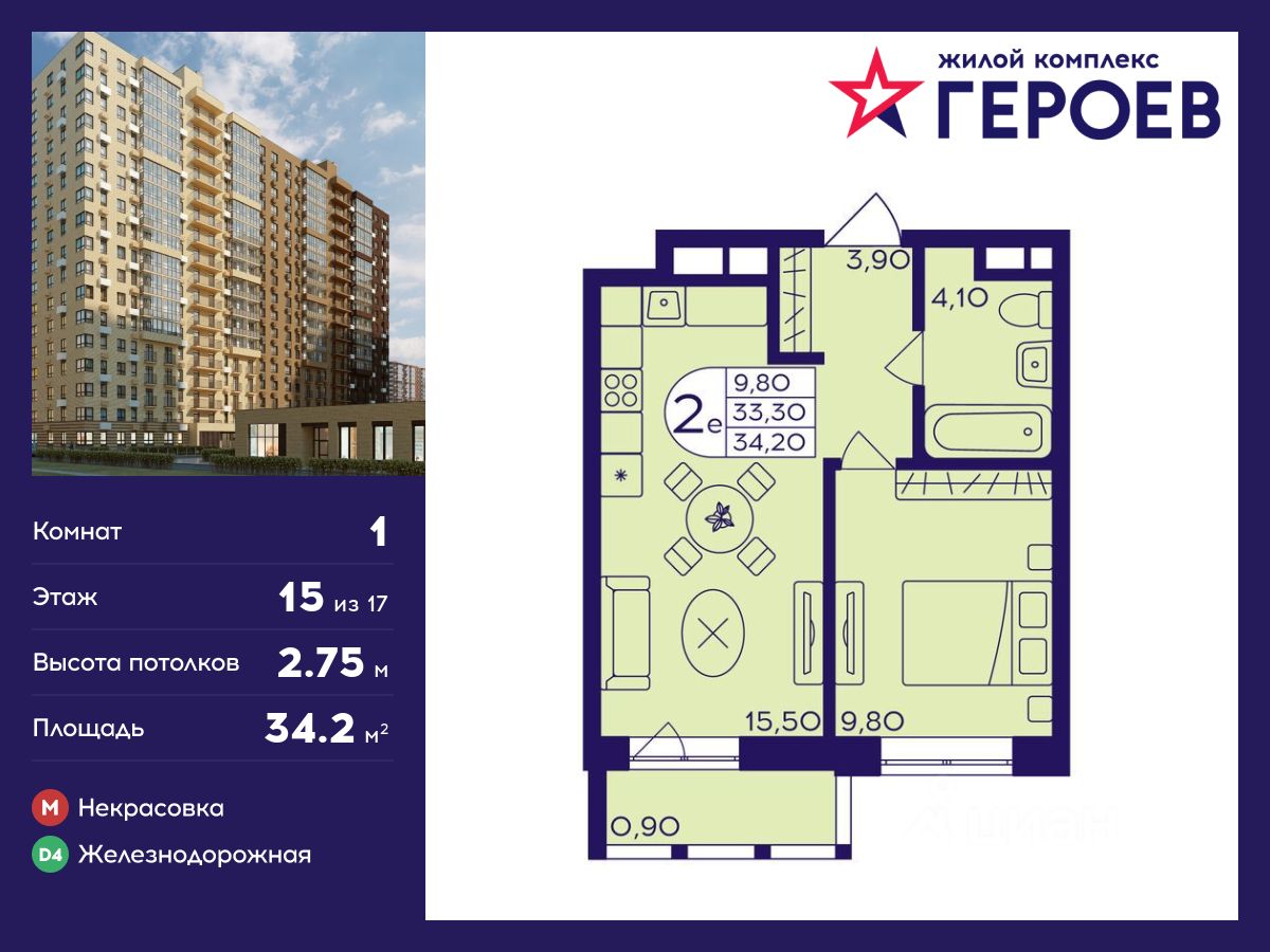 Продаётся 1-комнатная квартира 34.20 кв. м. в жилом комплексе "Героев" в Балашихе, Железнодорожный. Квартира расположена на 15 этаже 410 корпуса.