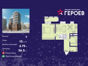 Продаётся 1-комнатная квартира 36.30 кв. м. в жилом комплексе "Героев" в Балашихе, Железнодорожный. Квартира расположена на 12 этаже 410 корпуса.