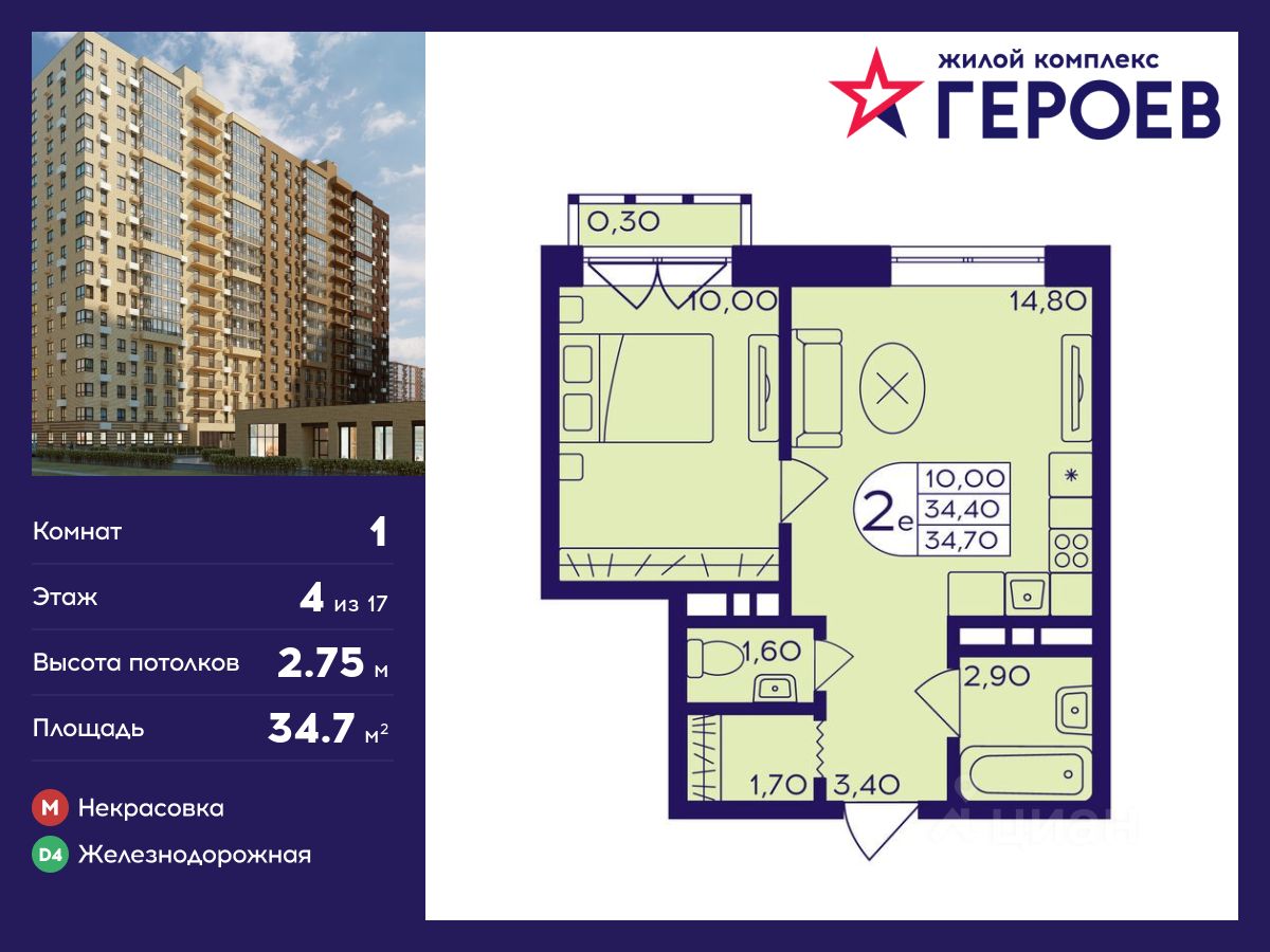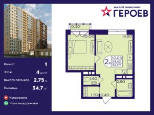 Продаётся 1-комнатная квартира 34.70 кв. м. в жилом комплексе "Героев" в Балашихе, Железнодорожный. Квартира расположена на 4 этаже 410 корпуса.