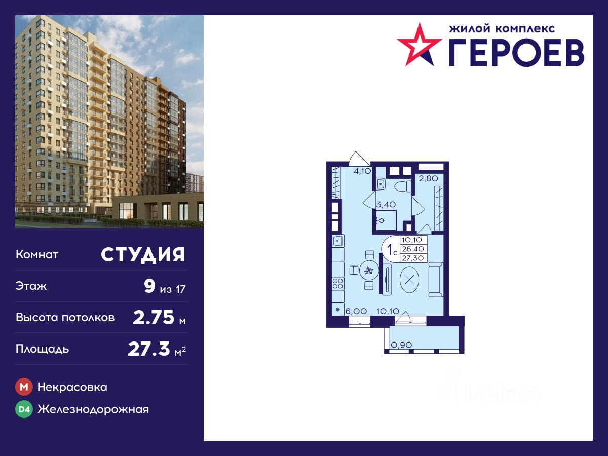 Продаётся студия 27.30 кв. м. в жилом комплексе "Героев" в Балашихе, Железнодорожный. Квартира расположена на 9 этаже 410 корпуса.