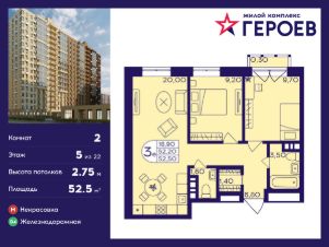 Продаётся 2-комнатная квартира 52.50 кв. м. в жилом комплексе "Героев" в Балашихе, Железнодорожный. Квартира расположена на 5 этаже 410 корпуса.