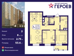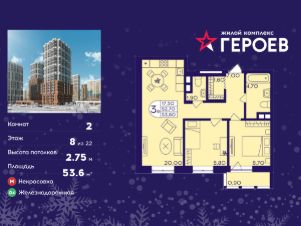 Продаётся 2-комнатная квартира 53.60 кв. м. в жилом комплексе "Героев" в Балашихе, Железнодорожный. Квартира расположена на 8 этаже 410 корпуса.