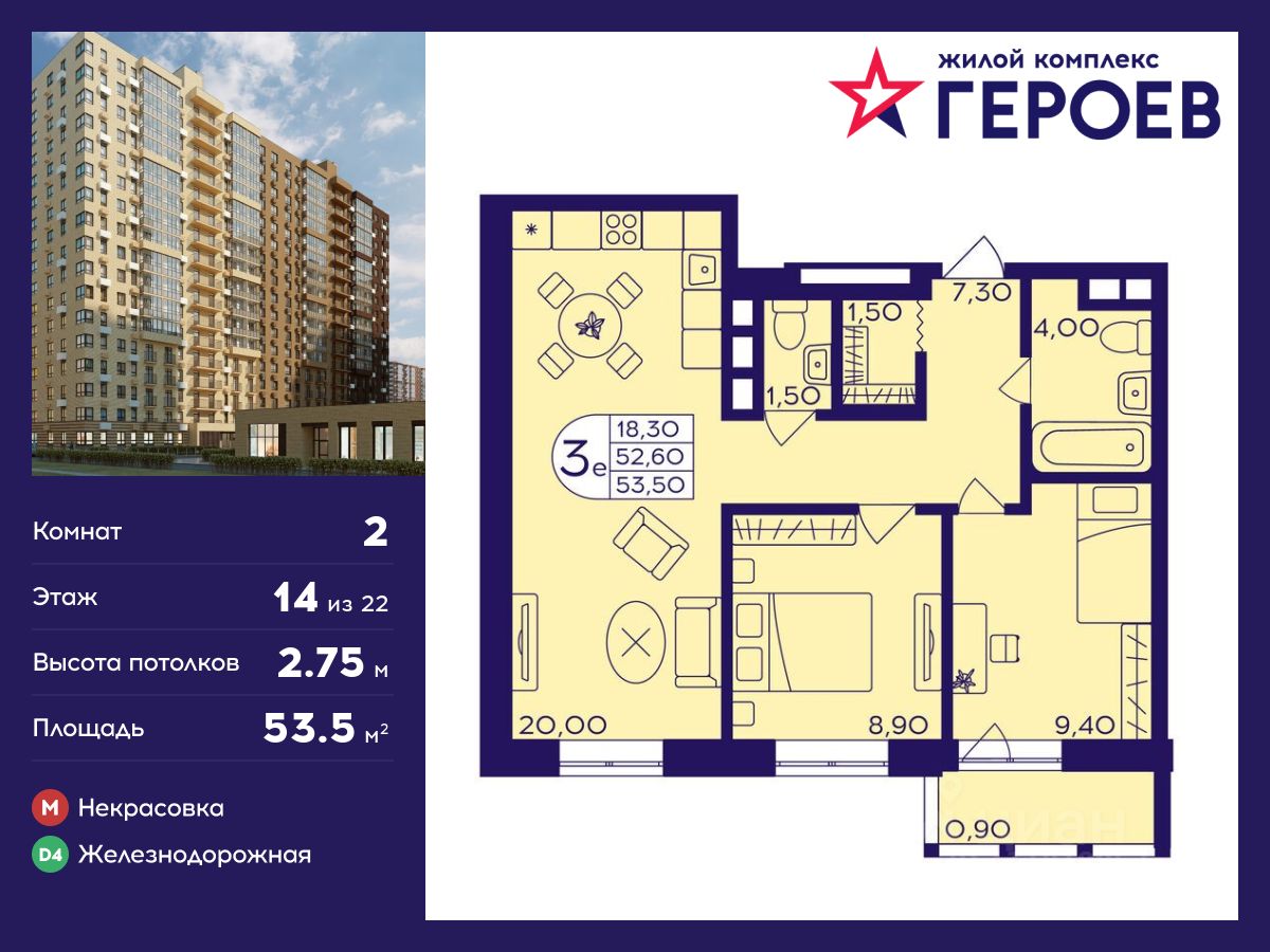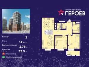 Продаётся 2-комнатная квартира 53.50 кв. м. в жилом комплексе "Героев" в Балашихе, Железнодорожный. Квартира расположена на 14 этаже 410 корпуса.