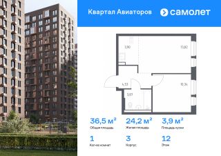 Предлагается 1-комнатная квартира комфорт-класса 36,46 кв.м в корпусе 3 на 12 этаже, в ЖК "Квартал Авиаторов"