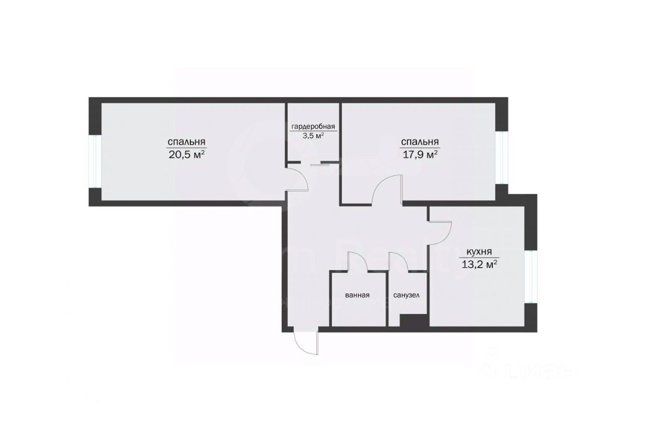 Общая площадь 75,8 кв.м.: кухня — 13,2 кв.м., просторные комнаты 17,9 кв.м., и 20,5 кв.м. Просторная гардеробная- 3,5 кв.м. Раздельный санузел, с душем.