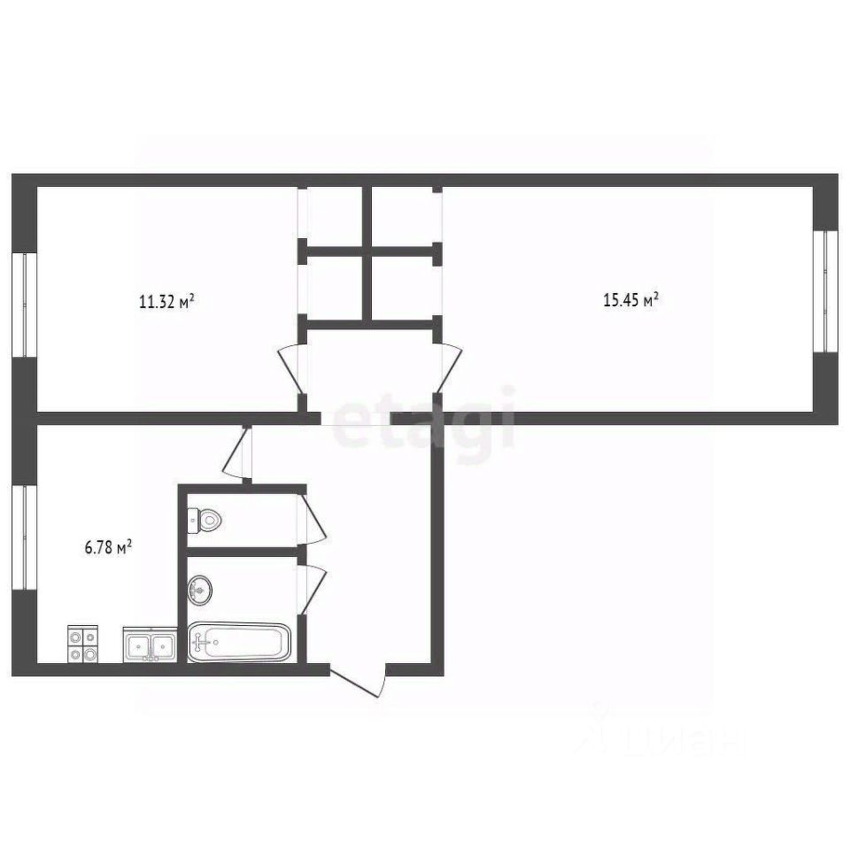 Площадь 44,9м, две комнаты 14м и 15м, кухня 6м, санузел совмещенный.
