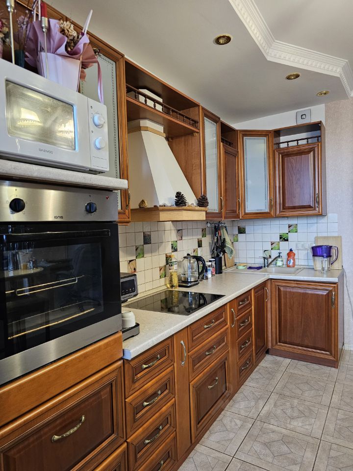 Вся мебель и техника остаётся.Кухня большая шпон черешни,3 шкафа купе,кровать,диван, холодильник,встроенная электрическая плита, микроволновая печь,стиралаьная машина, телевизор.Есть барная стойка, кондиционер,на кухне подготовлено место для посудомойки.Двери из красного дерева.