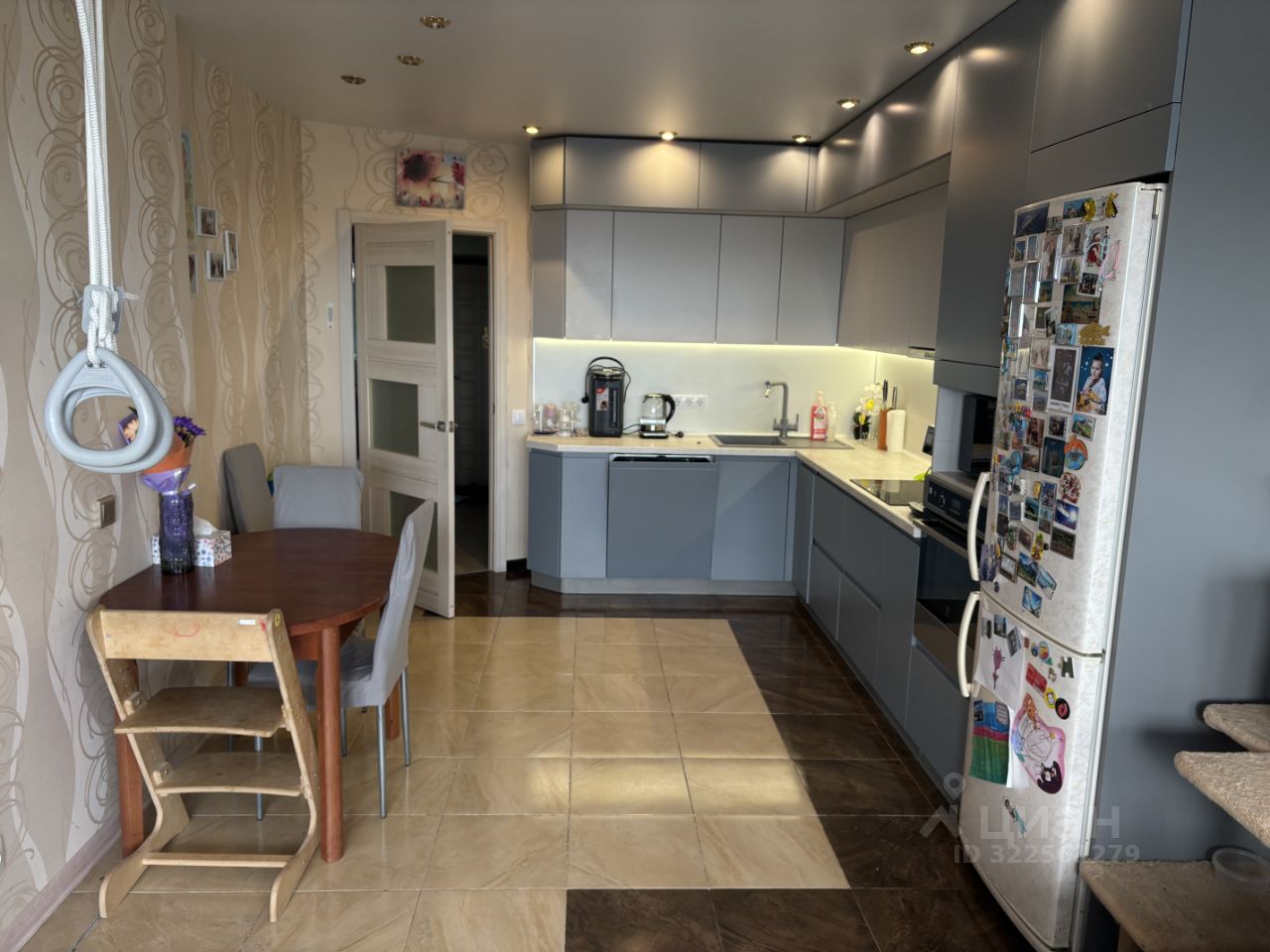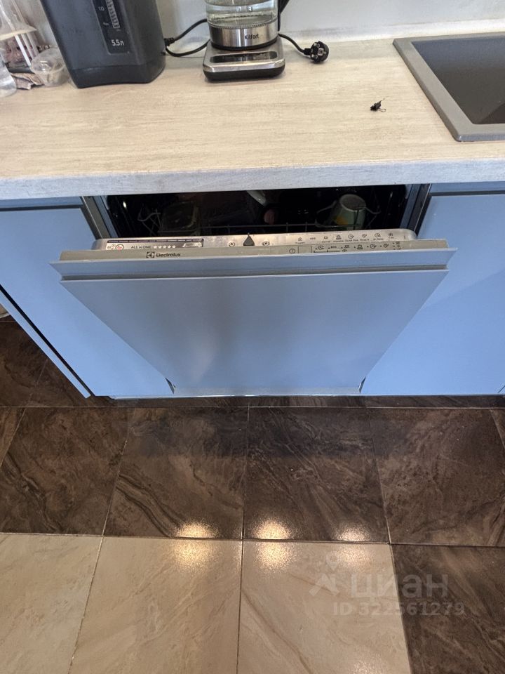 Большая кухня с гостиной. Теплый пол. На кухне установлена посудомоечная машина, фильтр обратного осмоса. В гостиной кондиционер, который справляется в том числе и с кухней.