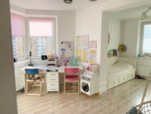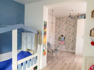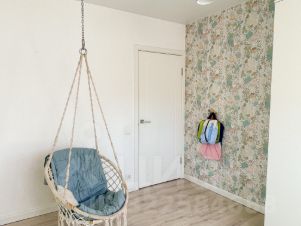 Детская тоже разделена на две зоны, спальная и учебно-игровая. В детской разместились уютные кресло-качели. Любимое место отдыха всех детей и взрослых.