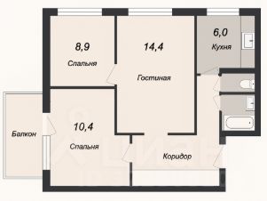 Комнаты смежно-изолированные: 14,4 м² / 10,4 м² / 8,9 м²