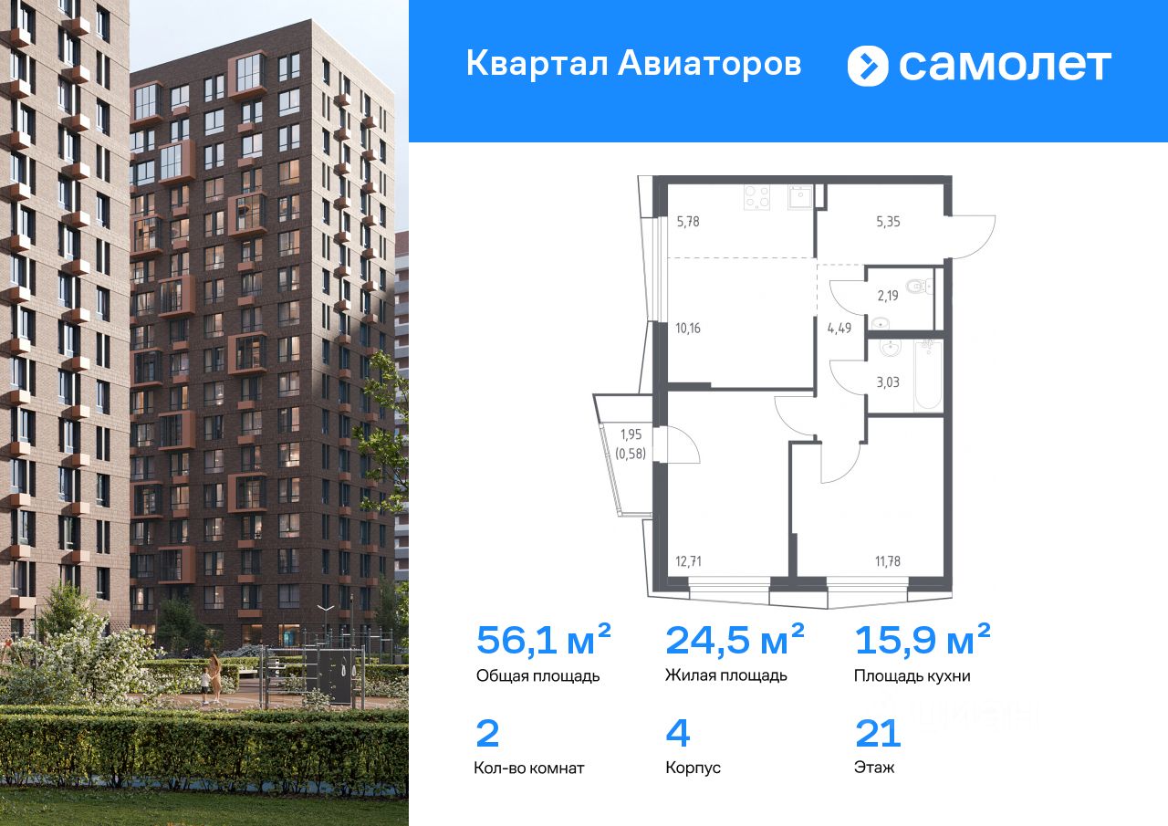 Строим кварталы для жизни с заботой о будущем. Предлагается 2-комнатная квартира комфорт-класса 56,07 кв.м в корпусе 4 на 21 этаже, в ЖК "Квартал Авиаторов"