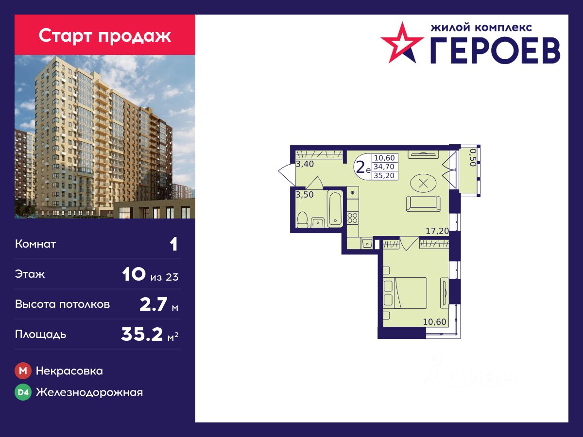 Продаётся 1-комнатная квартира 35.20 кв. м. в жилом комплексе "Героев" в Балашихе, Железнодорожный. Квартира расположена на 10 этаже 610 корпуса.