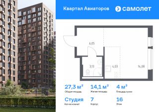 Строим кварталы для жизни с заботой о будущем. Предлагается квартира студия комфорт-класса 27,29 кв.м в корпусе 7 на 16 этаже, в ЖК "Квартал Авиаторов"