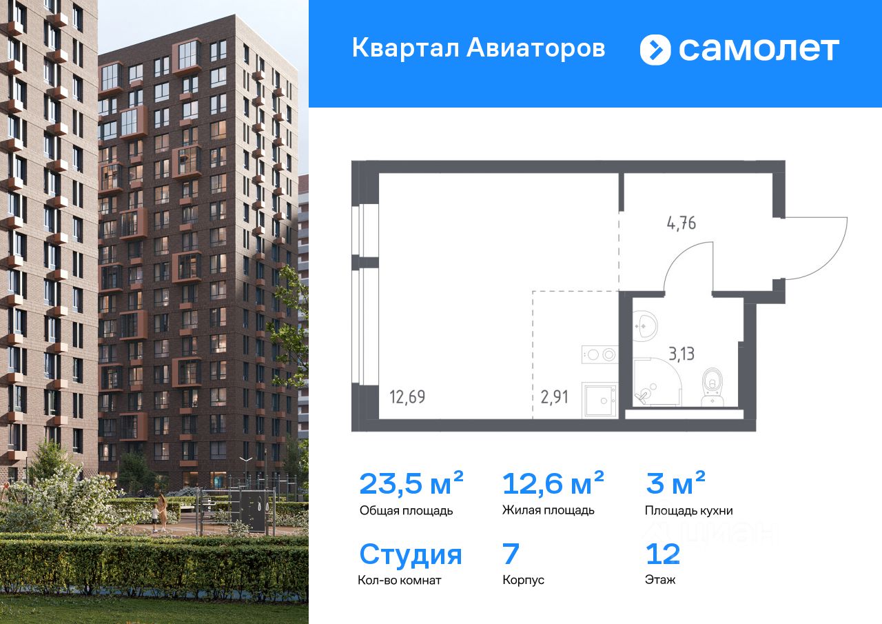 Строим кварталы для жизни с заботой о будущем. Предлагается квартира студия комфорт-класса 23,49 кв.м в корпусе 7 на 12 этаже, в ЖК "Квартал Авиаторов"