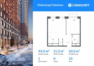 Строим кварталы для жизни с заботой о будущем. Предлагается 1-комнатная квартира комфорт-класса 42,9 кв.м в корпусе 6 на 15 этаже, в ЖК "Новоград Павлино"