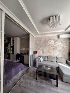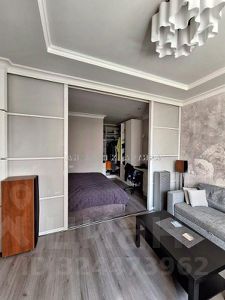 Большая гостиная отделена от спальной зоны передвижными тонированными стеклянными перегородками. В спальной установлен гардероб и туалетный столик.