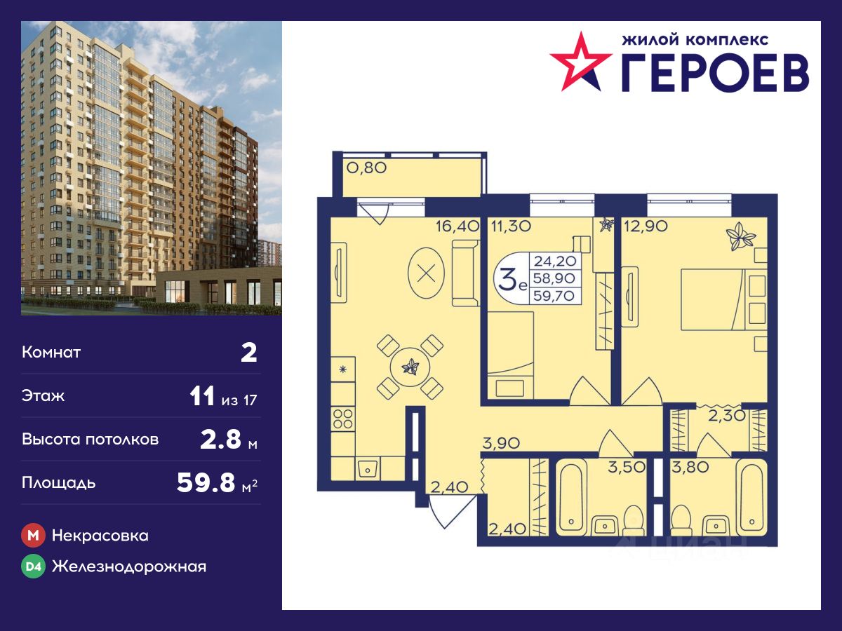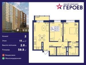 Продаётся 2-комнатная квартира 59.80 кв. м. в жилом комплексе "Героев" в Балашихе, Железнодорожный. Квартира расположена на 11 этаже 406 корпуса.