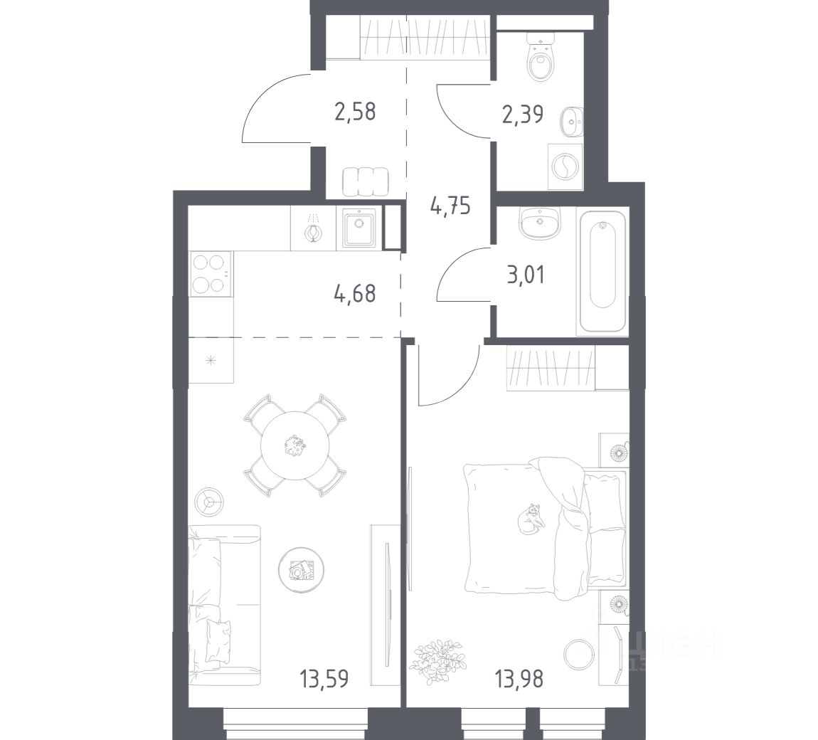Квартиры комплекса — на выбор: могут быть как с отделкой, так и без. В случае с готовой отделкой в комнатах и прихожей уже будут обои, натяжные потолки и ламинат, а в санузлах — керамогранит на полу и керамическая плитка на стенах. Мы подведем все коммуникации и установим сантехнику.