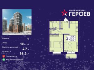 Продаётся 1-комнатная квартира 36.20 кв. м. в жилом комплексе "Героев" в Балашихе, Железнодорожный. Квартира расположена на 18 этаже 610 корпуса.