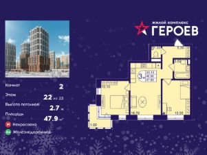 Продаётся 2-комнатная квартира 47.90 кв. м. в жилом комплексе "Героев" в Балашихе, Железнодорожный. Квартира расположена на 22 этаже 610 корпуса.