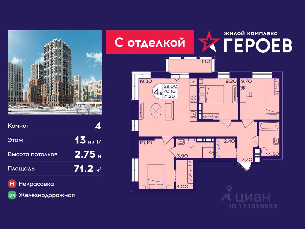 Продаётся 4-комнатная квартира 71.2 кв. м. в жилом комплексе "Героев" в Балашихе, Железнодорожный. Квартира расположена на 13 этаже 411 корпуса.