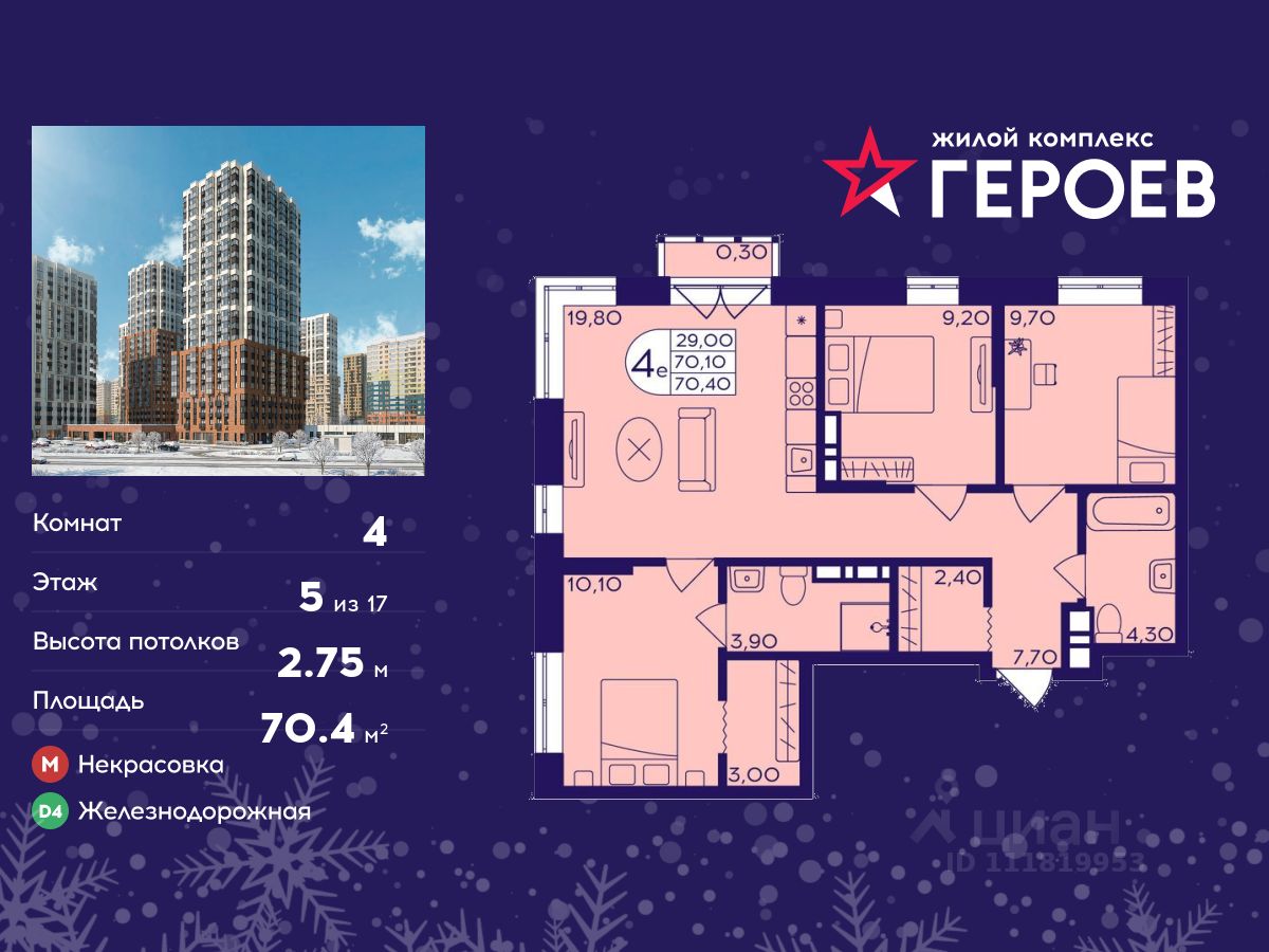 Продаётся 4-комнатная квартира в формате евро 70.40 кв. м. в жилом комплексе "Героев" в Балашихе, Железнодорожный. Квартира расположена на 5 этаже 411 корпуса.