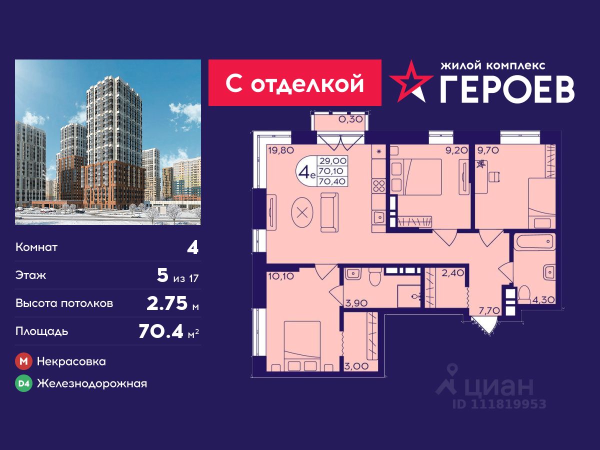 Продаётся 4-комнатная квартира 70.4 кв. м. в жилом комплексе "Героев" в Балашихе, Железнодорожный. Квартира расположена на 5 этаже 411 корпуса.