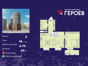 Продаётся 2-комнатная квартира в формате евро 40.00 кв. м. в жилом комплексе "Героев" в Балашихе, Железнодорожный. Квартира расположена на 16 этаже 410 корпуса.