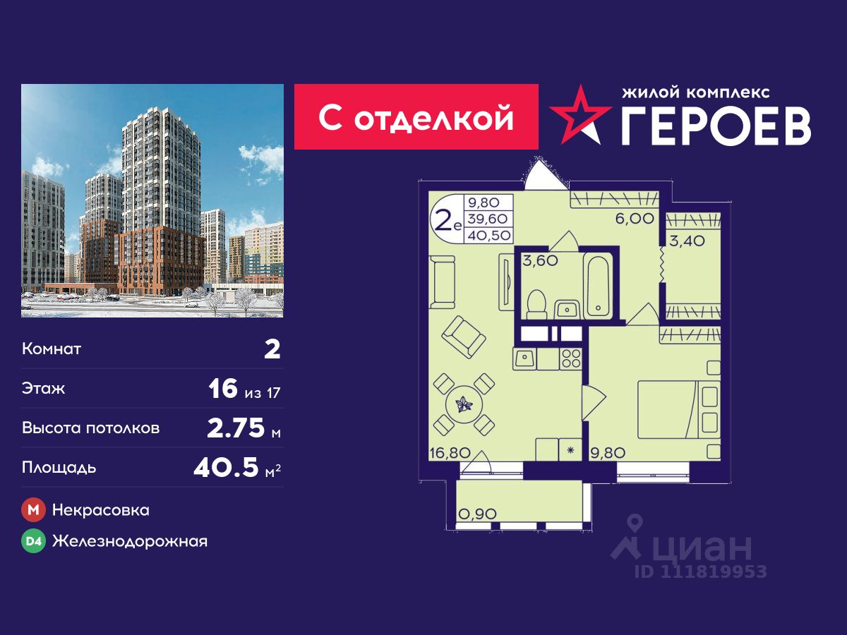 Продаётся 2-комнатная квартира 40.5 кв. м. в жилом комплексе "Героев" в Балашихе, Железнодорожный. Квартира расположена на 16 этаже 410 корпуса.