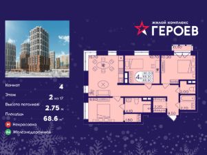 Продаётся 4-комнатная квартира в формате евро 68.60 кв. м. в жилом комплексе "Героев" в Балашихе, Железнодорожный. Квартира расположена на 2 этаже 410 корпуса.