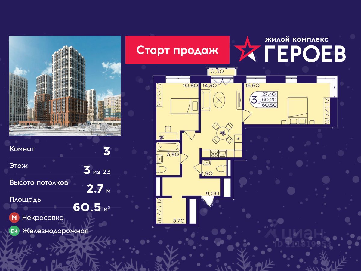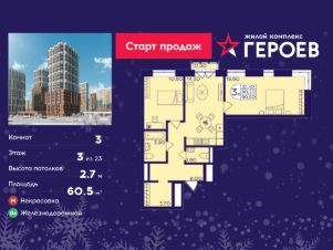 Продаётся 3-комнатная квартира в формате евро 60.50 кв. м. в жилом комплексе "Героев" в Балашихе, Железнодорожный. Квартира расположена на 3 этаже 610 корпуса.