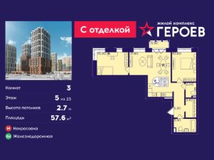 Продаётся 3-комнатная квартира 57.6 кв. м. в жилом комплексе "Героев" в Балашихе, Железнодорожный. Квартира расположена на 5 этаже 610 корпуса.