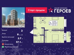 Продаётся 2-комнатная квартира в формате евро 37.10 кв. м. в жилом комплексе "Героев" в Балашихе, Железнодорожный. Квартира расположена на 9 этаже 610 корпуса.