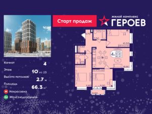 Продаётся 4-комнатная квартира в формате евро 66.30 кв. м. в жилом комплексе "Героев" в Балашихе, Железнодорожный. Квартира расположена на 10 этаже 610 корпуса.