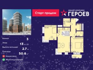 Продаётся 3-комнатная квартира в формате евро 50.60 кв. м. в жилом комплексе "Героев" в Балашихе, Железнодорожный. Квартира расположена на 13 этаже 610 корпуса.