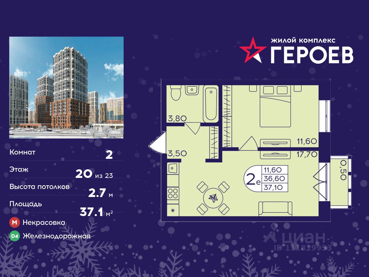 Продаётся 2-комнатная квартира в формате евро 37.10 кв. м. в жилом комплексе "Героев" в Балашихе, Железнодорожный. Квартира расположена на 20 этаже 610 корпуса.