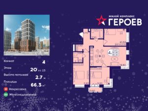 Продаётся 4-комнатная квартира в формате евро 66.30 кв. м. в жилом комплексе "Героев" в Балашихе, Железнодорожный. Квартира расположена на 20 этаже 610 корпуса.