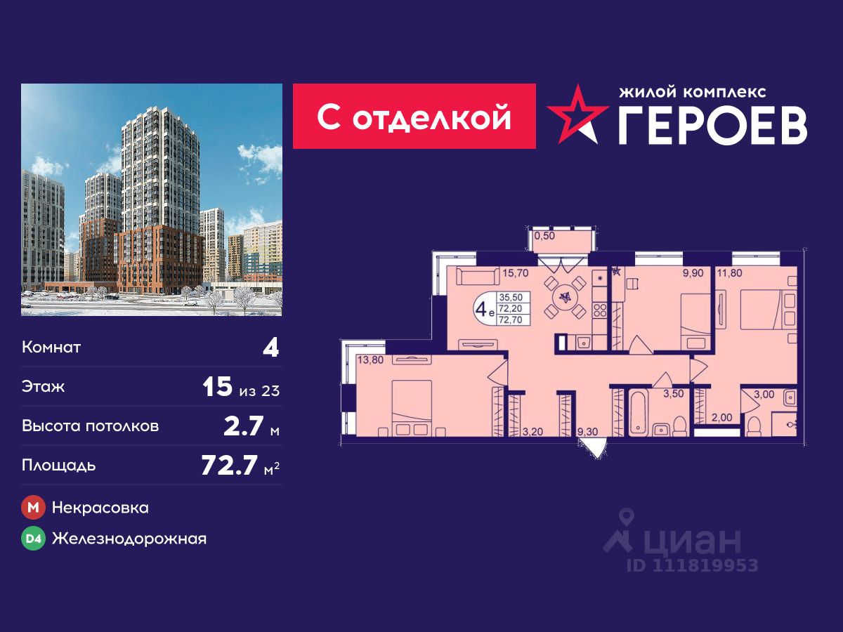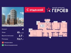 Продаётся 4-комнатная квартира 72.7 кв. м. в жилом комплексе "Героев" в Балашихе, Железнодорожный. Квартира расположена на 15 этаже 610 корпуса.
