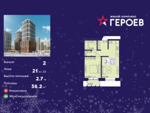 Продаётся 2-комнатная квартира в формате евро 36.20 кв. м. в жилом комплексе "Героев" в Балашихе, Железнодорожный. Квартира расположена на 21 этаже 610 корпуса.