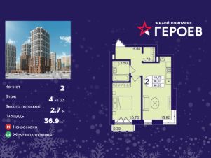 Продаётся 2-комнатная квартира в формате евро 36.90 кв. м. в жилом комплексе "Героев" в Балашихе, Железнодорожный. Квартира расположена на 4 этаже 610 корпуса.