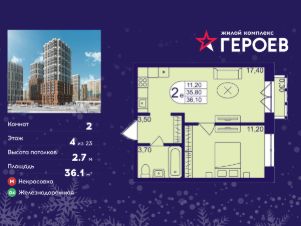 Продаётся 2-комнатная квартира в формате евро 36.10 кв. м. в жилом комплексе "Героев" в Балашихе, Железнодорожный. Квартира расположена на 4 этаже 610 корпуса.