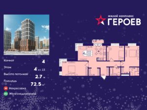 Продаётся 4-комнатная квартира в формате евро 72.50 кв. м. в жилом комплексе "Героев" в Балашихе, Железнодорожный. Квартира расположена на 4 этаже 610 корпуса.