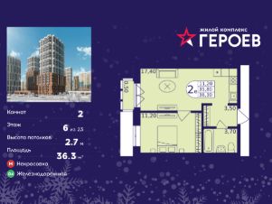 Продаётся 2-комнатная квартира в формате евро 36.30 кв. м. в жилом комплексе "Героев" в Балашихе, Железнодорожный. Квартира расположена на 6 этаже 610 корпуса.