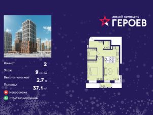 Продаётся 2-комнатная квартира в формате евро 37.10 кв. м. в жилом комплексе "Героев" в Балашихе, Железнодорожный. Квартира расположена на 9 этаже 610 корпуса.