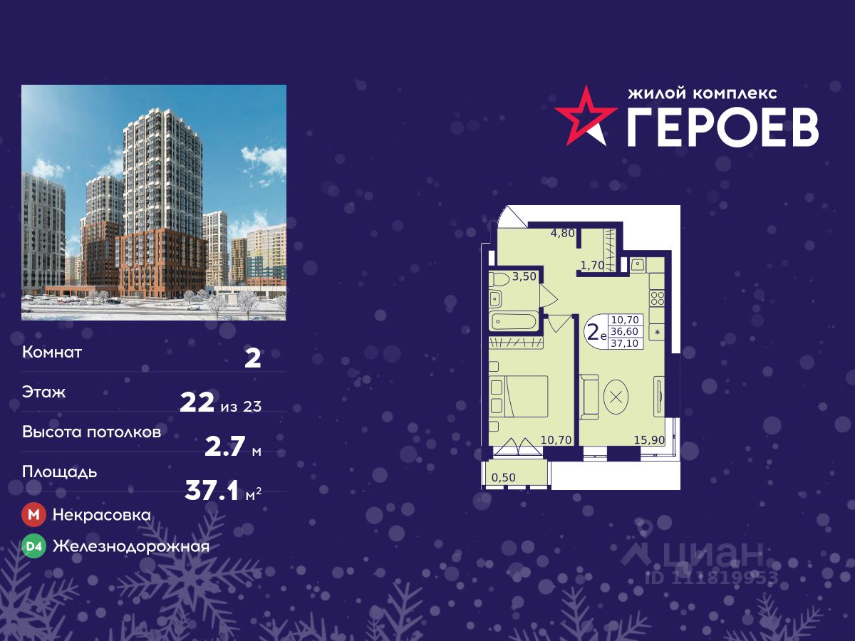 Продаётся 2-комнатная квартира в формате евро 37.10 кв. м. в жилом комплексе "Героев" в Балашихе, Железнодорожный. Квартира расположена на 22 этаже 610 корпуса.
