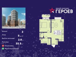 Продаётся 2-комнатная квартира в формате евро 35.50 кв. м. в жилом комплексе "Героев" в Балашихе, Железнодорожный. Квартира расположена на 5 этаже 413 корпуса.