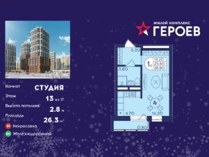 Продаётся студия 26.30 кв. м. в жилом комплексе "Героев" в Балашихе, Железнодорожный. Квартира расположена на 13 этаже 406 корпуса.