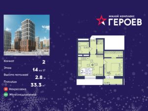 Продаётся 2-комнатная квартира в формате евро 33.30 кв. м. в жилом комплексе "Героев" в Балашихе, Железнодорожный. Квартира расположена на 14 этаже 406 корпуса.