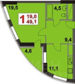 • Планировка: Прихожая (9,4 кв.м), изолированная кухня (11,1 кв.м), большая жилая комната (19,5 кв.м), утеплённая лоджия (4,6 кв.м), просторный совмещённый санузел (4,5 кв.м).