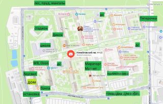 Детские сады (гос-ые и частные), общеобразовательная школа, аптеки, поликлиника, частные клиники, магазины (сетевые и локальные), кафе, Wildbеrriеs, Оzоn, Яндекс.Маркет, СДЭК, почта, спортплощадки, спортзалы, салоны красоты, студии лепки и рисования, школы иностранных языков, стадион, площадка для выгула собак и пр